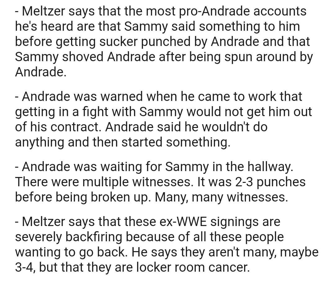 Even in the most pro-Andrade accounts Andrade is clearly the instigator. I love Andrade, but man is going about this entirely the wrong way, but the internet will still say this Sammy’s fault or even Punk’s somehow. There’s a cancer in that locker room that has nothing to do with Punk and Tony needs to address it asap or shit is gonna get worse.