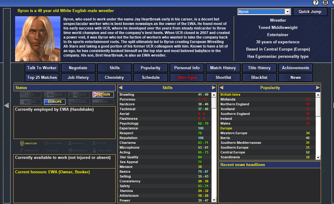 Here's another little story I've been following in my Cverse sim. So EWA which is the top European company is ran by this dude named Byron who's still wrestling in his late 40s and has now booked himself into 10 world title reigns.