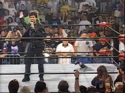 “Mean Gene” Okerlund and JJ Dillon are in the ring; J.J. recommended Savage be fined $50k for his action. They considered suspending him, but felt that would be playing right into his hands since he can’t seem to figure out how to deal with Diamond Dallas Page. No longer will DDP-Savage II be sanctioned by WCW, it will now be a “lights out” match where anything goes and falls count anywhere. Savage & Liz are back; Savage says he’s got $100 grand set aside for what he did last week to JJ Dillon and what he’s about to do to JJ Dillon this week. HA! HA! Savage makes his way thru the crowd but before he gets to the ring, DDP runs out. Page says to hell with GAB, now's the time, here's the place, let's do it. Savage gets heated and agrees and he heads down towards the ring. Savage finally gets thru the crowd and dives over the railing and the FIGHT IS ON :mark: They brawl all around the floor for about 30 seconds before they hit commercial.